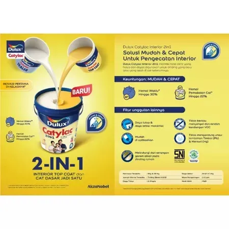 Dengan daya tutup tinggi dan hasil yang tidak mudah pudar, Dulux Catylac Interior menjadikan dinding rumah tampak baru lebih lama. Pilihan warnanya yang beragam juga memberikan fleksibilitas untuk menyesuaikan dengan gaya interior modern maupun klasik.